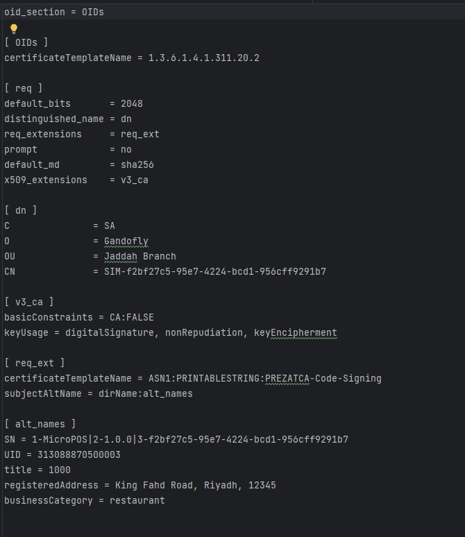 First, we generate the OTP from the portal, then the CSR (the openssl config for the CSR will be attached below), and request a CCSID and the PCSID. We also tried checking for compliance using the Compliance API which returned with 202 status “REPORTED” but no solution appears to be onboarded on the portal. Where could the issue be in this case? Also is there a restriction on the VAT Numbers which can be used in the simulation environment? As in test mode some API endpoint such as the Reporting API only accepted the default test VAT Number.